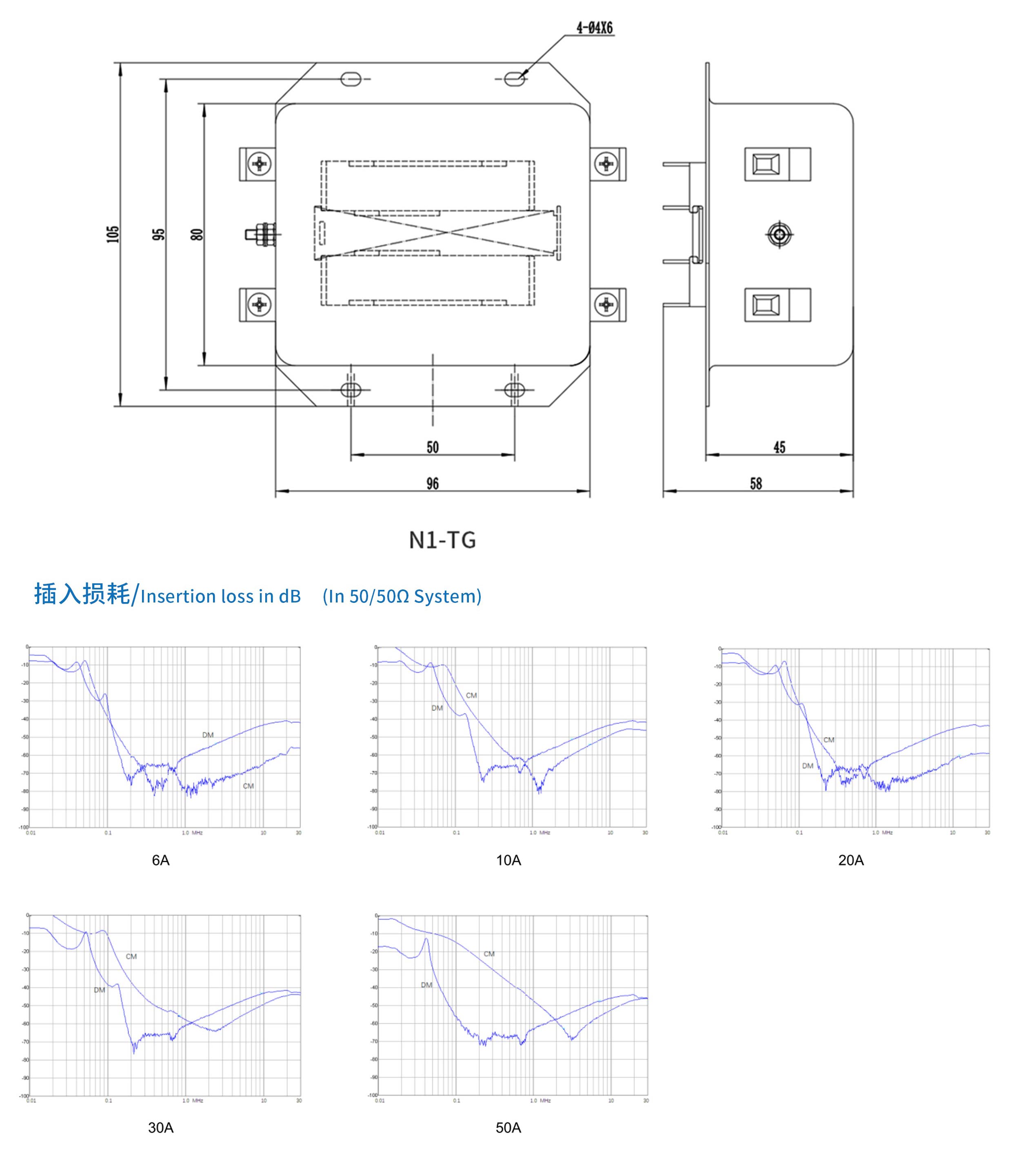 高性能型电源滤波器,在10KHz~30MHz宽范围内具有较好的共模和差模滤波效果,三节滤波,可解决绝大多数设备的EMC/EMI问题