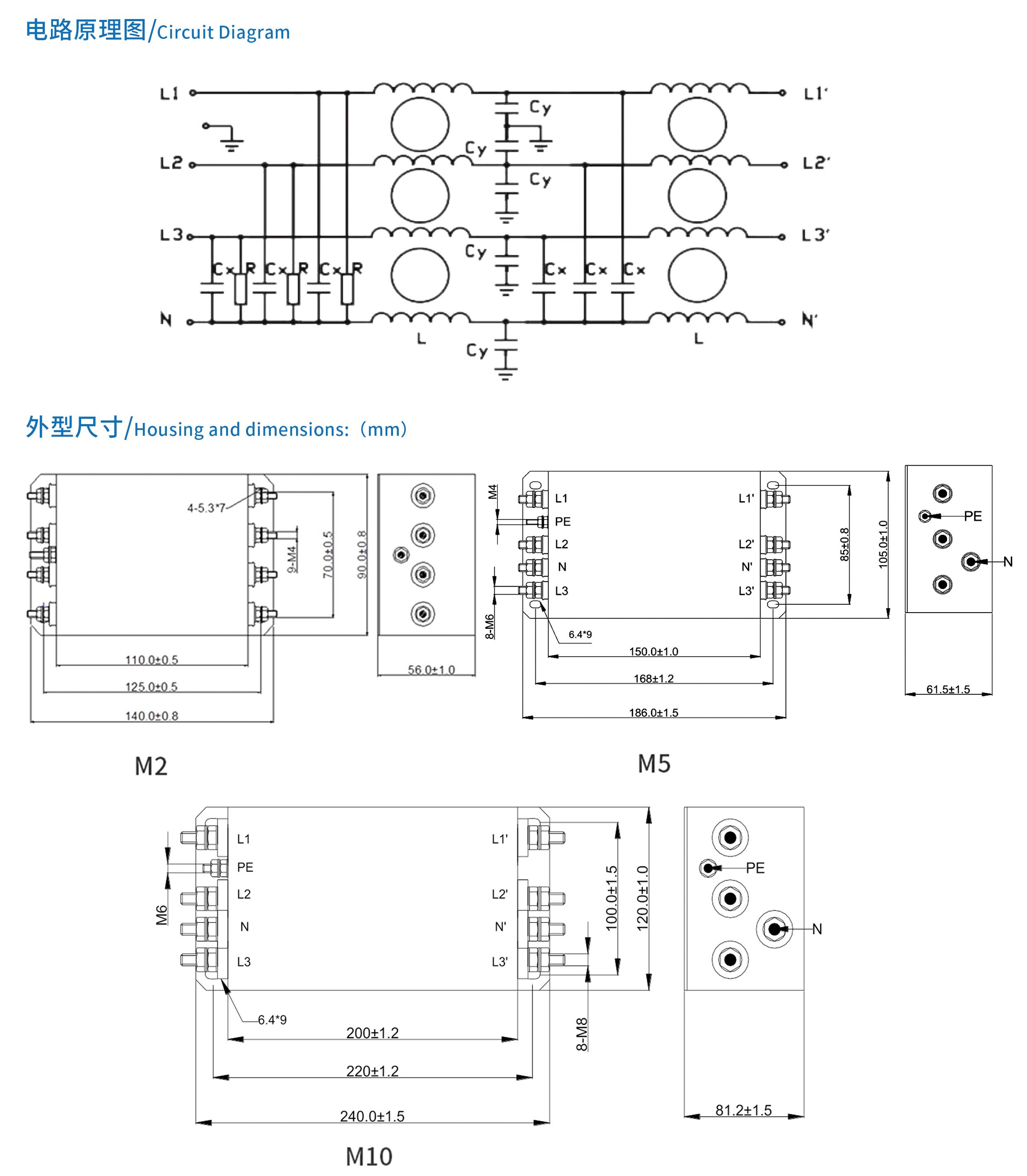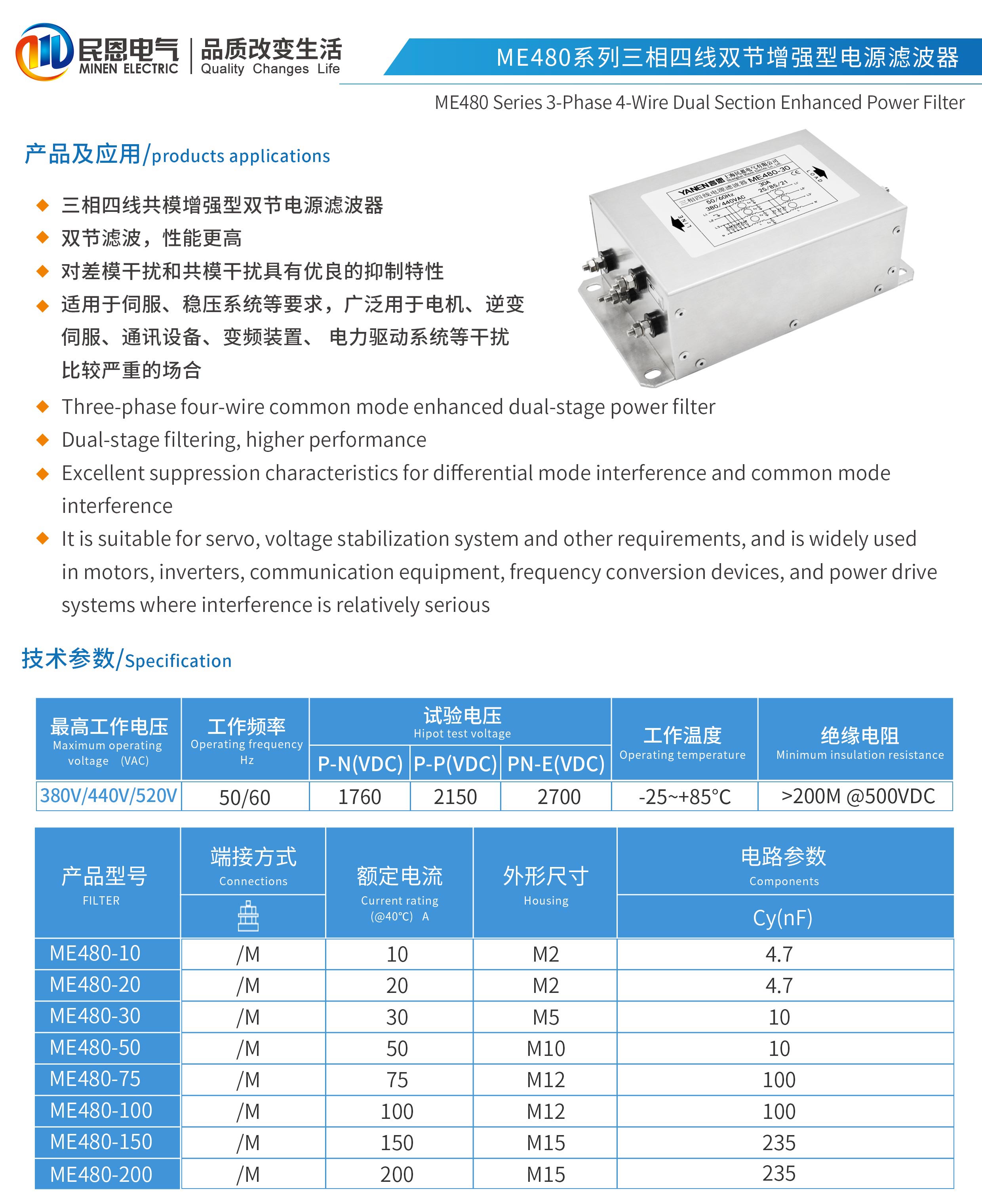 三相四线共模增强型双节电源滤波器,双节滤波,性能更高,对差模干扰和共模干扰具有优良的抑制特性