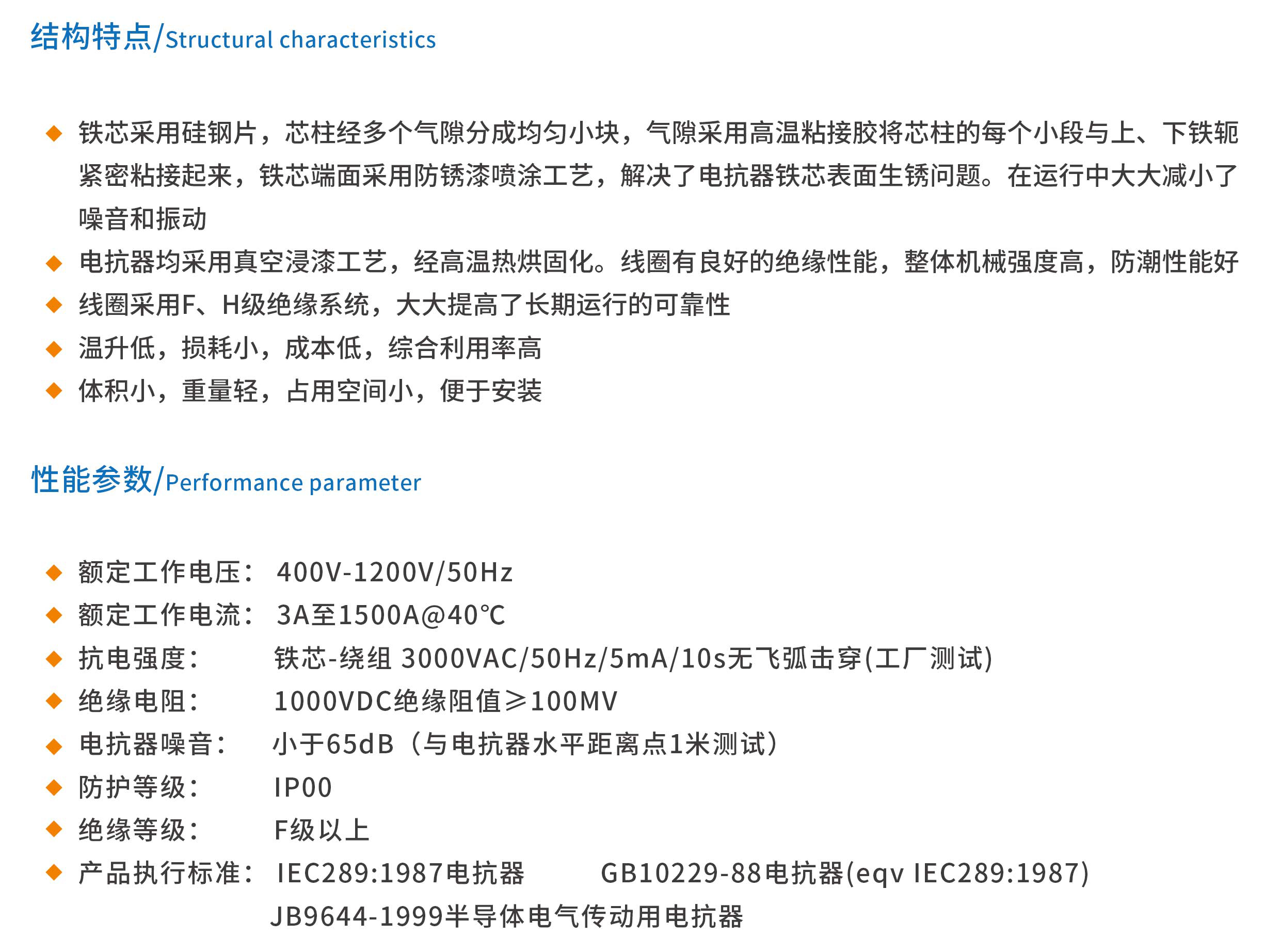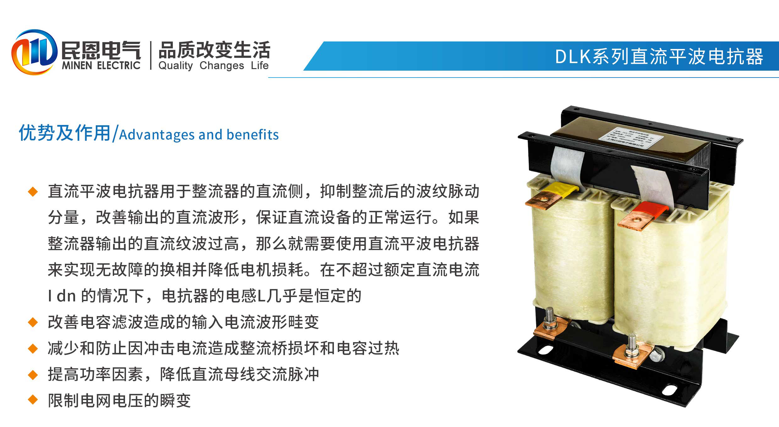 直流平波电抗器用于整流器的直流侧,抑制整流后的波纹脉动分量,改善输出的直流波形,保证直流设备的正常运行。如果整流器输出的直流纹波过高,那么就必须使用直流平波电抗器来实现无故障的换相并降低电机损耗,铁芯采用优质硅钢片,芯柱经多个气隙分成均匀小块,气隙采用高温高强度粘接胶将芯柱的每个小段与上、下铁紧密粘接起来,铁芯端面采用高品质防锈漆喷涂工艺,解决了电抗器铁 芯表面生锈问题,在运行中大大减小了噪音和振动,电抗器均采用真空浸漆工艺,经高温热烘固化。线圈有良好的绝缘性能,整体机械强度高,防潮性能好线圈采用F、H级绝缘系统,大大提高了长期运行的可靠性,温升低,损耗小,成本低,综合利用率高,体积小,重量轻,占用空间小,便于安装