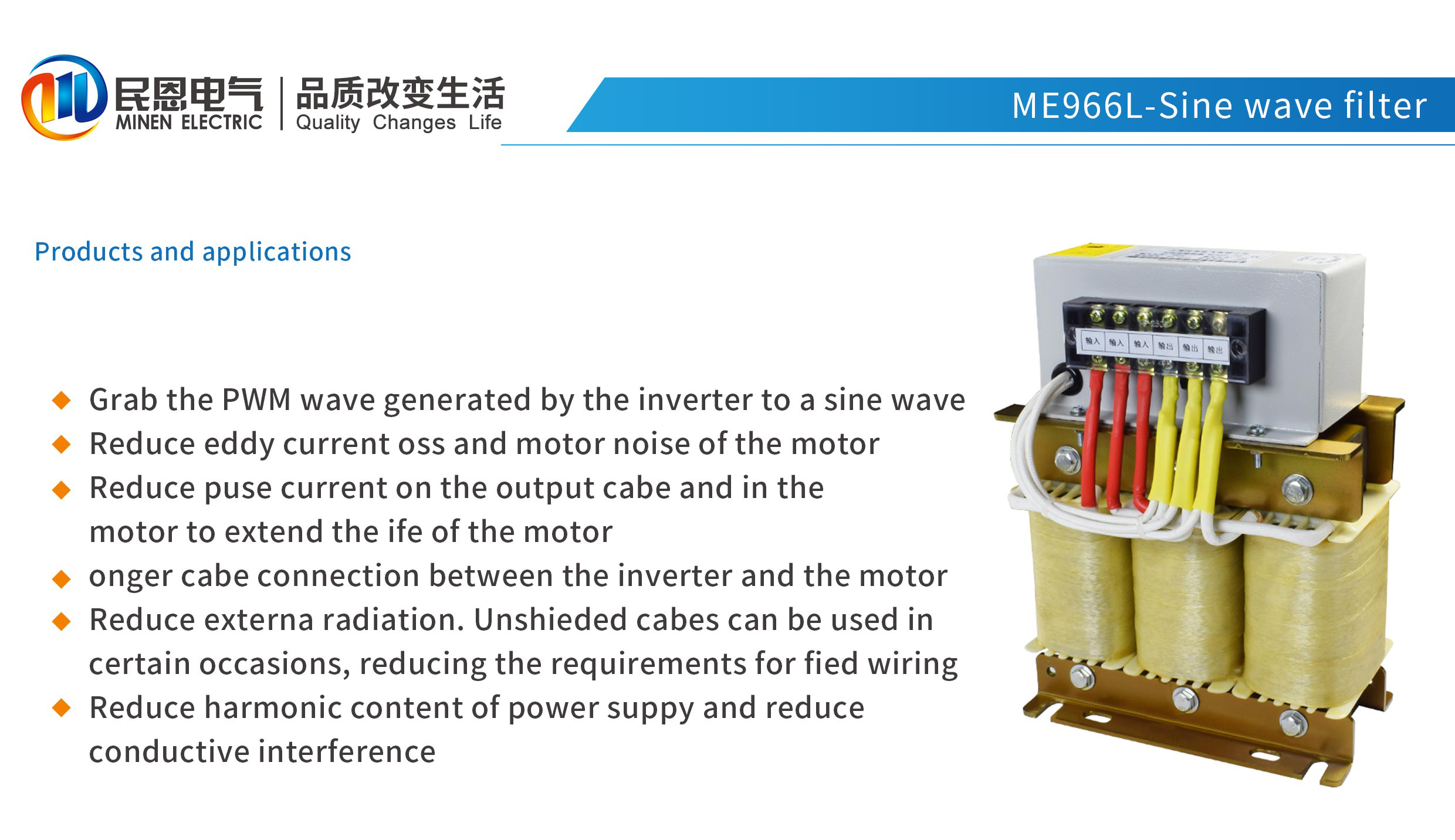将变频器产生的PWM波转换为正弦波,降低电机的涡流损耗以及电机噪声,减少输出电缆上和电机中的脉冲电流,延长电机寿命,可在变频器与电机间使用更长的电缆联线,减小对外的辐射,在一定场合可以使用非屏蔽电缆降低了对现场布线的要求,降低电源谐波含量,减少传导性干扰